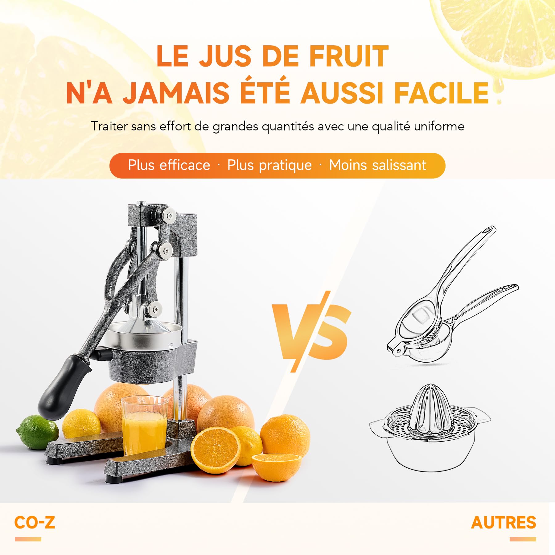- PRESSE AGRUMES PROFESSIONNEL : Le presse-agrumes manuel de CO-Z fournit un jus frais de qualité commerciale à partir de n'importe quel fruit mou ou pulpeux, des mandarines aux limes de Perse, des citrons Eureka aux pommes, des clémentines, des pamplemousses, et plus encore.