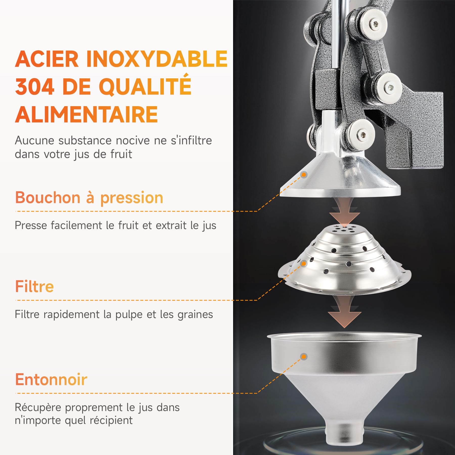 - FACILE À NETTOYER : La passoire en acier inoxydable capture la pulpe et les graines, mais se détache pour être vidée et lavée sans problème après chaque séance ; l'entonnoir se détache également pour faciliter la manipulation dans un évier ou un lave-vaisselle.
